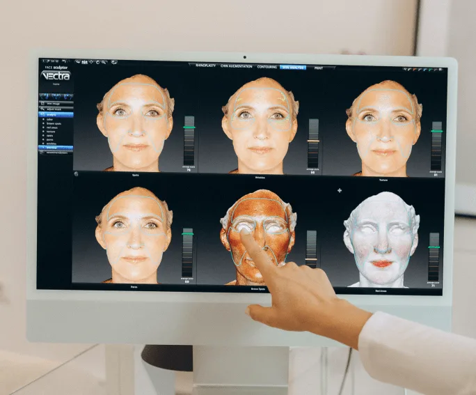 Comprehensive assessment with Vectra 3D provides a detailed and comprehensive analysis of the skin’s condition. It captures high-resolution images from multiple angles, allowing for a thorough examination of various skin parameters such as texture, tone, pigmentation, wrinkles, and pores. This comprehensive assessment helps our professionals gain a holistic understanding of the skin’s health and aids in developing personalized treatment plans for you.